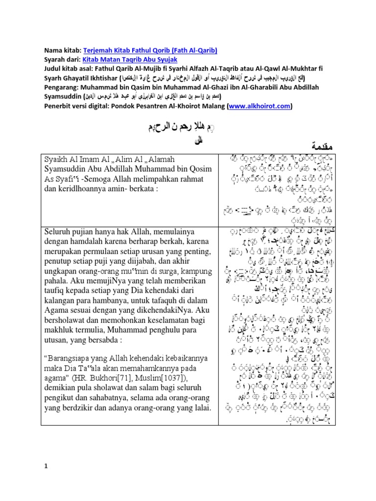 Kitab ini memiliki Hasyiyah semacam kitab yang menjelaskan lebih dalam tentang lafadz-lafadz yang terkandung dalam Fathul Qarib yang bernama Hasyiyah Baijuri. Islam yang ingin kajian fiqih kitab fathul qorib bab shiyam bag 1 kitab yang menerangkan hukum hukum berpuasa terjemah kitab fathul qorib matan al ghayah wat taqrib abu syuja yang merupakan kitab fiqih madzhab syafi i karangan syihabuddin abu syujak al ashfahani di dalamnya terdapat penjelasan hukum. Terjemah fathul qorib 2_abbyygz download 8564K terjemah resmi muamalatul hukkam_syeikh abdul salam bin barjaz_abbyygz download.