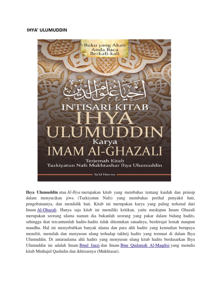 Ihya Ulumuddin atau Al-Ihya merupakan kitab yang membahas tentang kaidah dan prinsip dalam menyucikan jiwa Tazkiyatun Nafs yang membahas perihal penyakit hati pengobatannya dan mendidik hati. Bacaan ilmu dan pengetahuan agama Islam download Gratis ribuan bukunya di sini yang berformat pdf dan jangan lupa beli buku aslinya di toko-toko buku terdekat. SIMILAR ITEMS based on metadata.