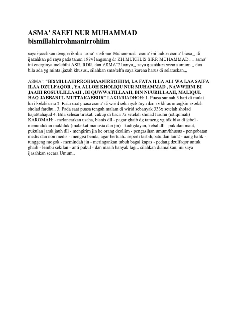 Dan terjemahan ini masih merupakan bagian pertama Bait 1 2011. Aku nur muhammad mesra sekalian batang tubuhInni bihaqqi Muhammadin alhaq qulhaq - sesungguhnya diriku adalah wujud kebesaran Nur Muhammad yang sebenarnya benarnya. Syaikh Khalid al-Azhari mengatakan.
