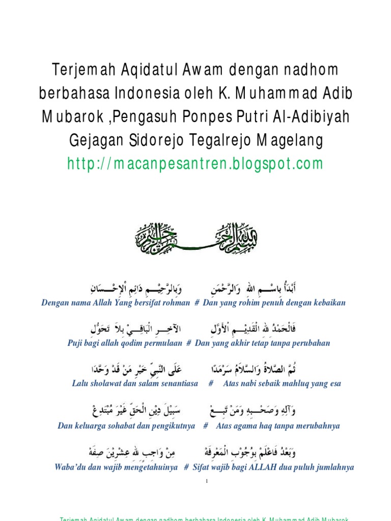 Terjemahan Bahasa Indonesia Aqidatul Awam. Abda-u bismillahi warrohmani wa birrohimi da-imil ihsani. Terjemahan Kitab Aqidatul Awam Berikut ini adalah terjemahan kitab nadham Aqidatul Awam dalam bahasa Indonesia yang bisa anda gunakan sebagai sumber belajar tentang aqidah Islamiyah.