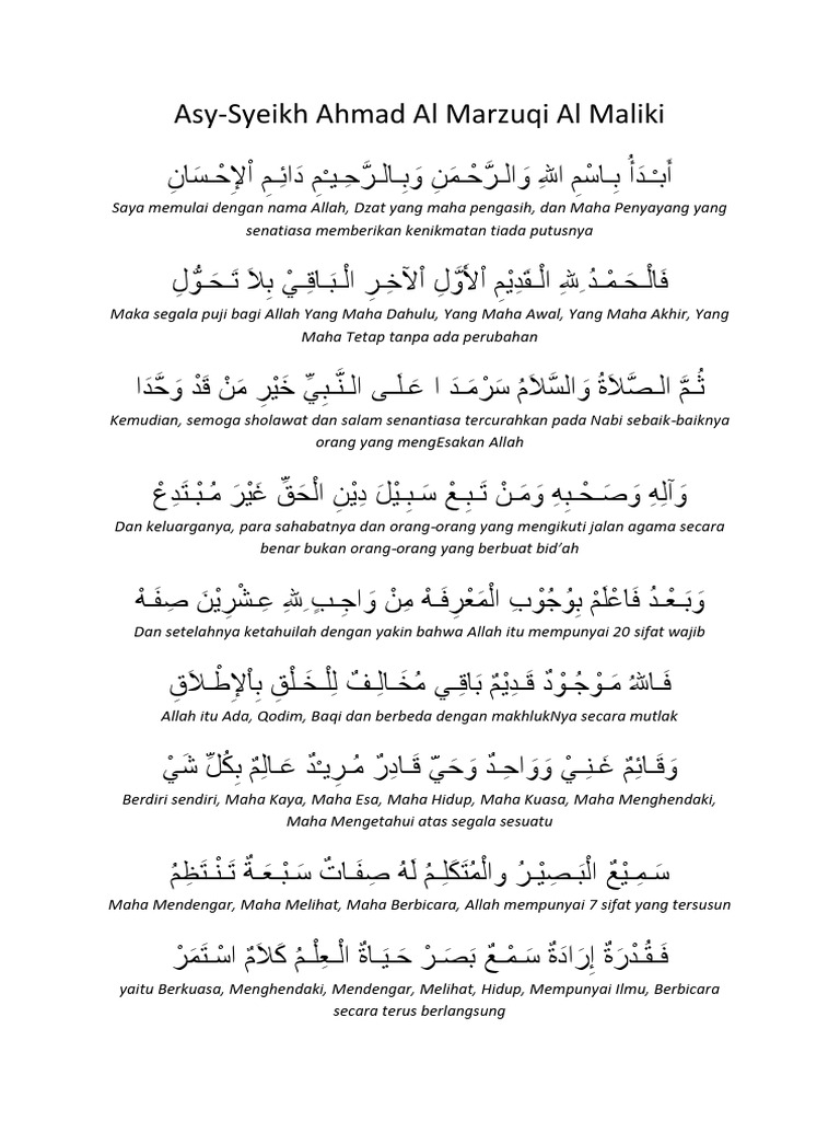 Meski terlihat kecil Kitab yang disusun oleh Ahmad bin Muhammad bin Sayyid Ramadhan al-Marzuqiy al. ابدأباسم الله والرحمن وبالرحيم دائم الأحسان 1. Aqidah ahlusunnah wal jamaah terjemahan Kitab Nazhom Aqidatul Awam عقيدة العوام karya Syaikh as-Sayyid al-Marzuqiy.