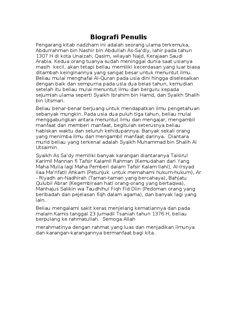 17 MB Download Gratis Buku Pdf Klik Di Sini Google Drive Bacaan ilmu dan pengetahuan agama Islam download Gratis ribuan bukunya di sini yang berformat pdf dan jangan lupa beli buku aslinya di toko-toko buku terdekat. Kita memuji-Nya memohon pertolongan serta ampunan-Nya dan kita berlindung kepada Allah dari kejelakan diri dan amal perbuatan. Pengarang kitab nadzham ini adalah seorang ulama terkemuka Abdurrahman bin Nashir bin Abdullah As-Sadiy lahir pada tahun 1307 H di kota Unaizah Qasim wilayah Najd Kerajaan Saudi Arabia.