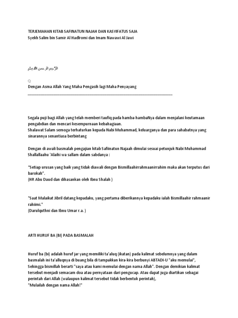 TERJEMAHAN KITAB SAFINATUN NAJAH DAN KASYIFATUS SAJA. Sebagaimana Kitab Fathul Qorib Kasifatus Saja adalah kitab fiqih yang populer dikaji santri pesantren karena disusun dengan tartib tematik dan menyimpan banyak masalah unik yang mudah dipecahkan. Setiap urusan yang baik yang tidak diawali dengan Bismillaahirrahmaanirrahim maka akan terputus dari barokah.
