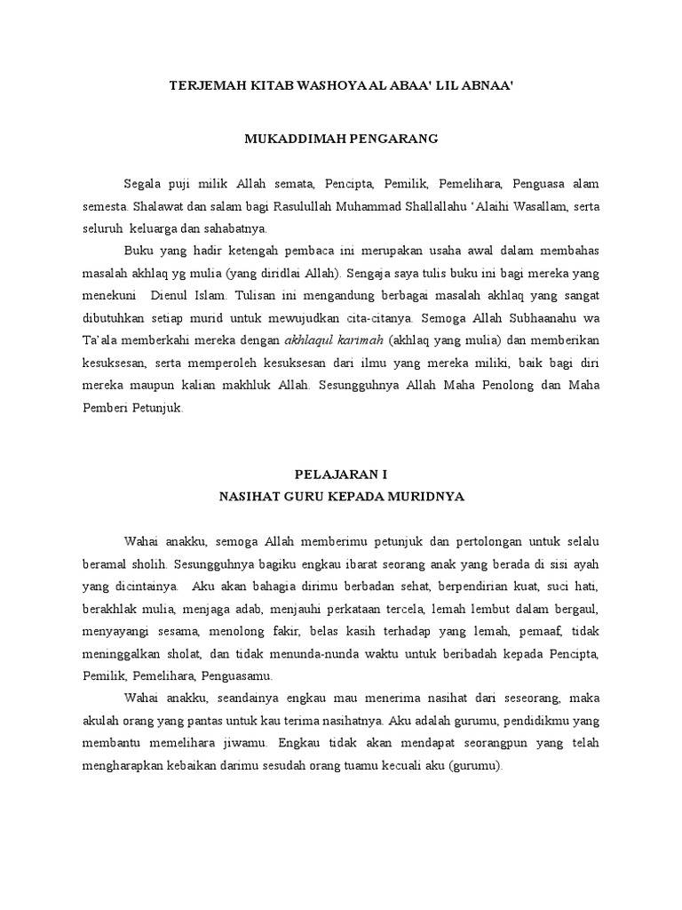 TERJEMAH KITAB WASHOYA AL ABAAdoc. Terjemah lengkap belum ada mas nyicil pasal per pasal. Selain dapat dibaca dengan menaikturunkan file langsung dari hape atau laptop tanpa mengunduh atau men download nya dibagikan juga link untuk mengunduh download terjemah washoya bahasa Indonesia dalam format PDF.