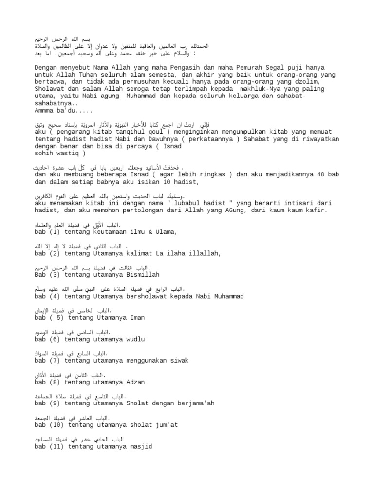 Silahkan download Klik di sini. 01 Bab 1 Mukadimah. Lubabul hadits bab ke - 1 keutamaan ilmu dan ulama Kitab Lubabul Hadits ini ditulis oleh Syekh Jalaluddin As-Suyuti Oleh umat Islam beliau lebih dikenal sebagai salah seorang dari penyusun tafsir Jalalain sebuah tafsir yang di beberapa pesantren di Indonesia sebagai kitab tafsir pegangan.